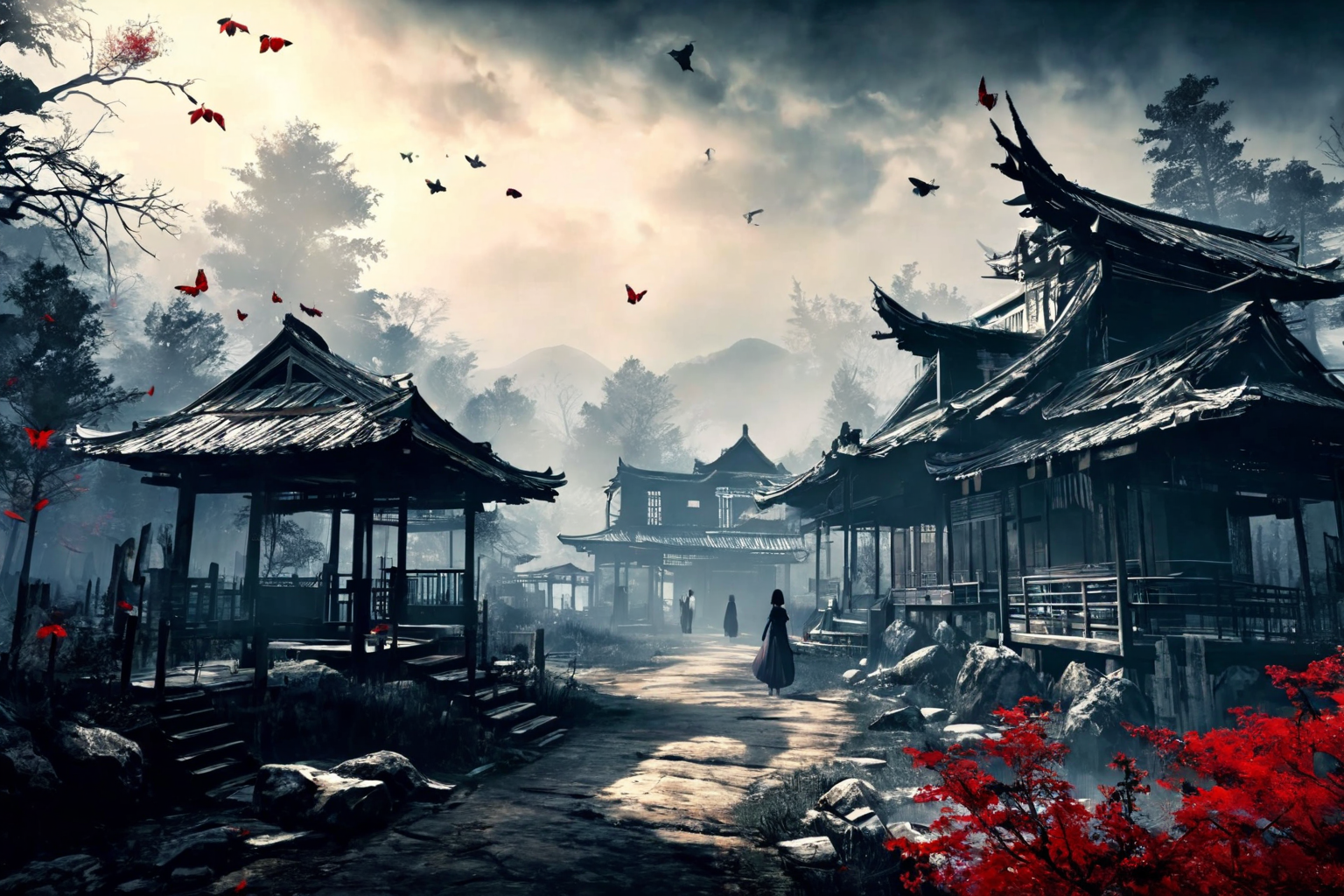 Game: Fatal Frame II: Crimson Butterfly (2003), Jasper Johns style, , survival horror, game title, Fatal Frame II, Crimson Butterfly, Minakami Village, tragic ritual, vengeful spirit, Sae Kurosawa, Camera Obscura, ghosts, mysteries, lost settlement, twin sisters, Mio and Mayu HD, sharp focus, stunningly beautiful, hyper-detailed, Silhouette Art, high contrast, well defined, Silhouette Art