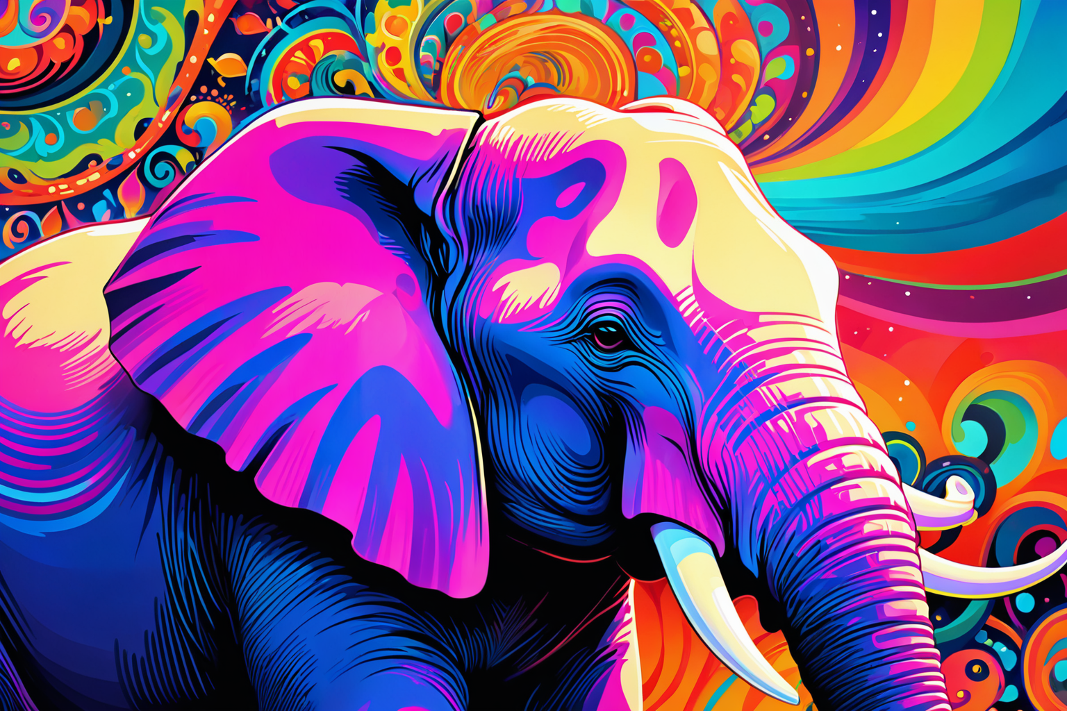 Elephant, Alexey Venetsianov style, HD, sharp focus, stunningly beautiful, hyper-detailed, psychedelic style, vibrant colors, swirling patterns, abstract forms, surreal, trippy