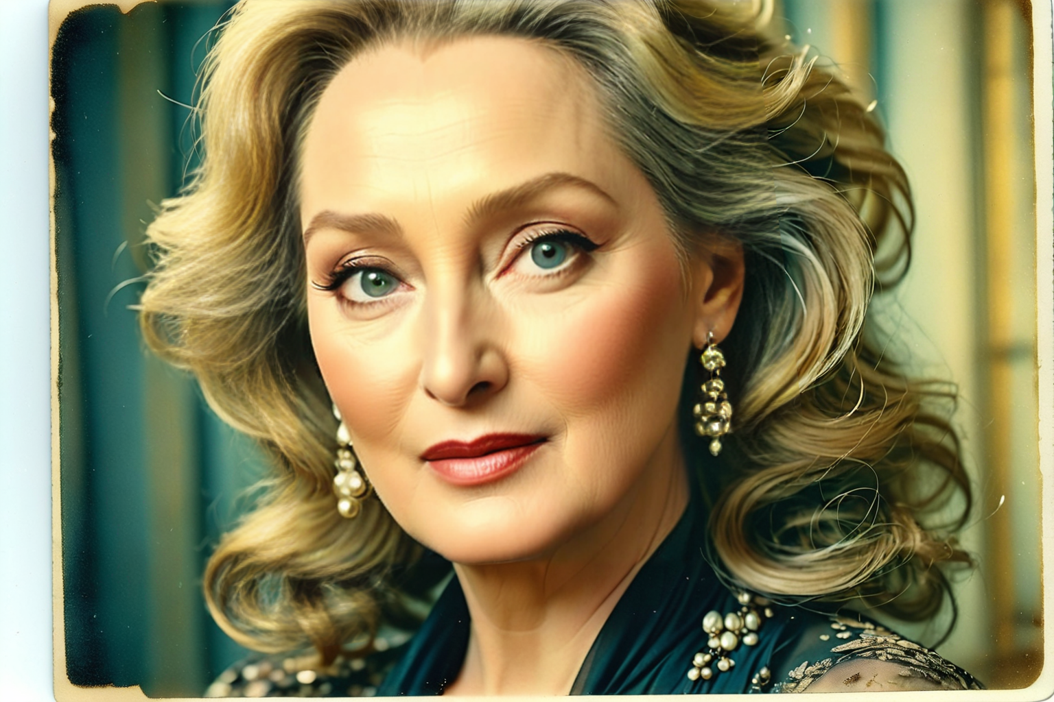 Meryl Streep, portrait, Vera Mukhina style,    HD, sharp focus, stunningly beautiful, hyper-detailed, Faded Polaroid Photo, analog, old faded photo, old polaroid