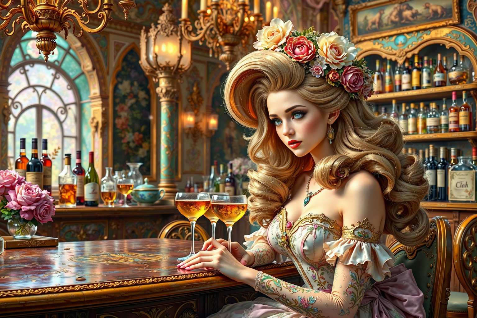 bar, Alphonse Mucha style, HD, sharp focus, stunningly beautiful, hyper-detailed, Rococo, flamboyant, pastel colors, curved lines, elaborate detail, Rococo
