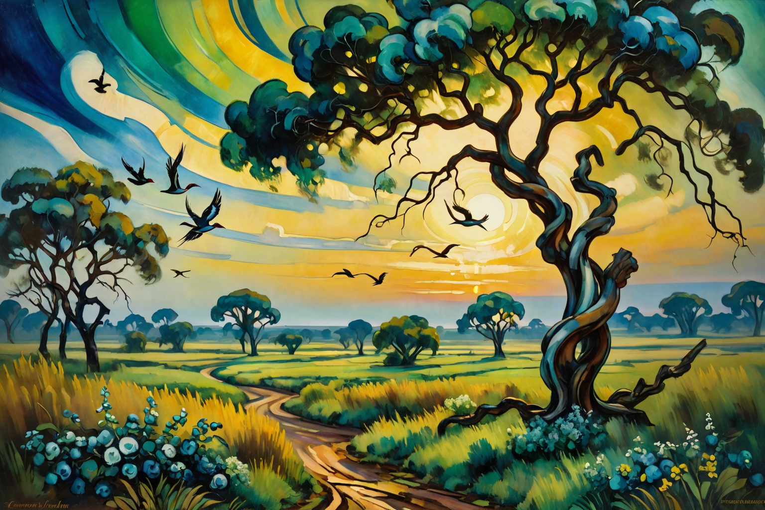 An ethereal morning in Angola’s savannah, circa 1920s, amidst a rare tornado. A majestic acacia tree, its branches tangled with vines, stands resilient against the swirling winds. Amidst the turmoil, a flock of birds takes flight, their iridescent feathers glistening in the dawn light. The sky above is a kaleidoscope of colors, a blend of blues and greens that seem to dance with the twister’s vortex. In the foreground, a few wisps of grasses and wildflowers sway gently, as if beckoning the viewer into this surreal scene. The style is reminiscent of Georges Rouault’s Art Nouveau masterpieces, executed in exquisite glass painting technique.