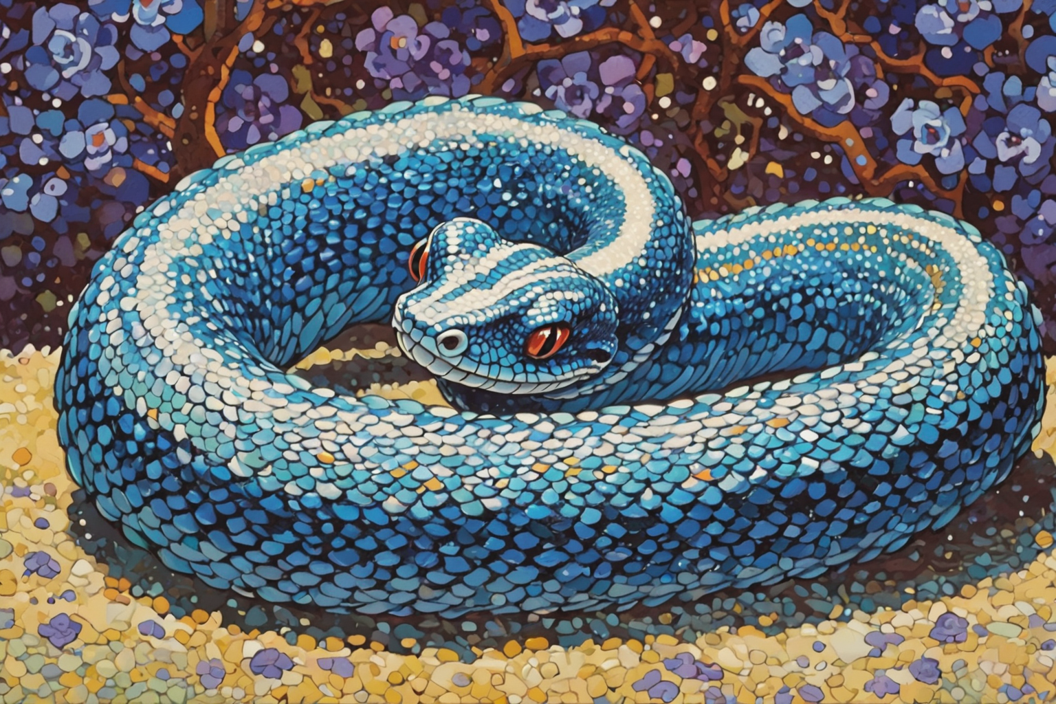 NSFW, Dwarf Boa, Nicholas Roerich style, HD, sharp focus, stunningly beautiful, hyper-detailed, Neo-Impressionism, tiny dabs of color, Pointillism, painterly, Neo-Impressionism
