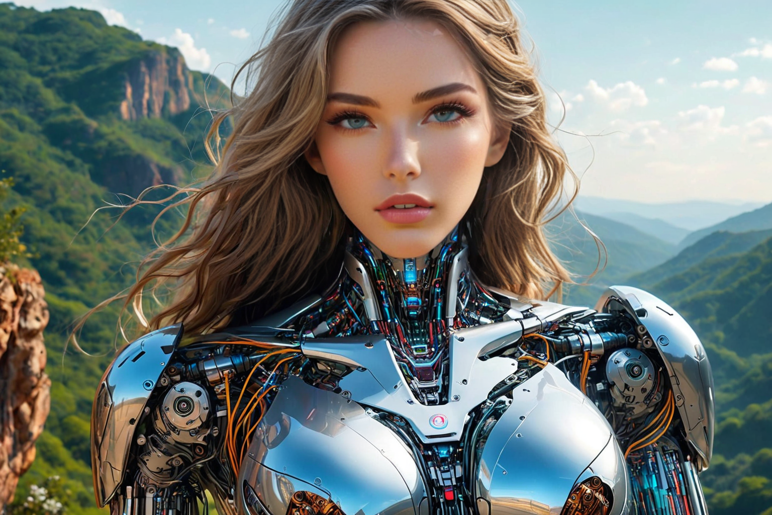 young woman, beautiful face, great body, gorgeous figure, long legs, pretty eyes, long hair, great bust, beautiful background, magnificent scenery, Karl Bryullov style, HD, sharp focus, stunningly beautiful, hyper-detailed, cybernetic robot, android, AI, machine, metal, wires, tech, futuristic, highly detailed