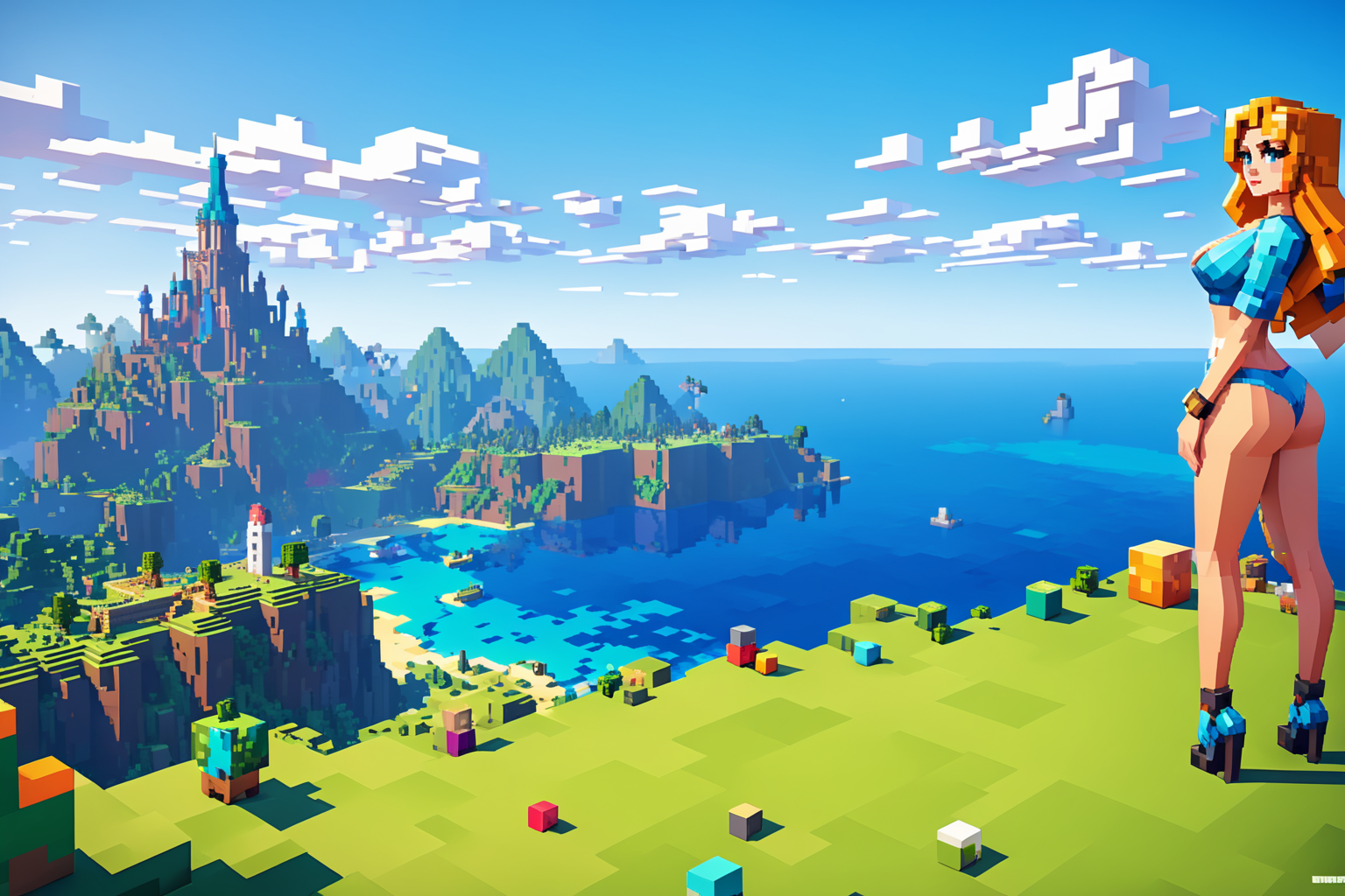 young woman, beautiful face, great body, gorgeous figure, long legs, pretty eyes, long hair, great bust, beautiful background, magnificent scenery, Olga Rozanova style, HD, sharp focus, stunningly beautiful, hyper-detailed, Minecraft style, blocky, pixelated, vibrant colors, recognizable characters and objects, game assets