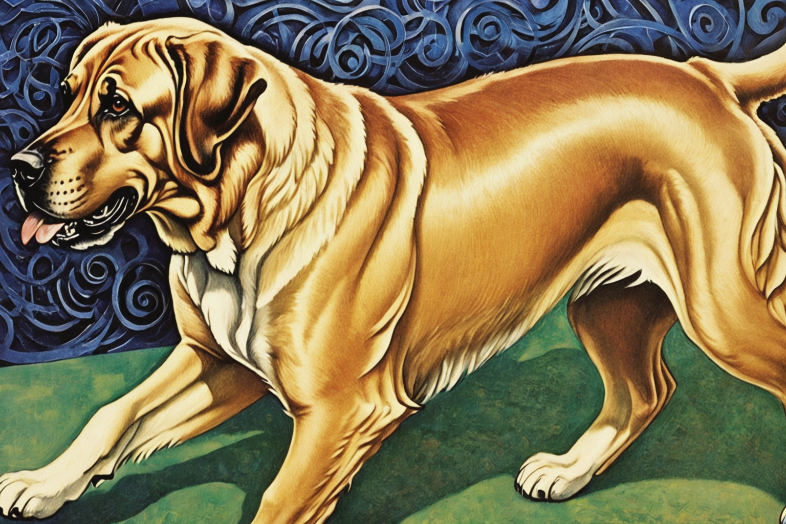 Spanish Mastiff, Kuzma Petrov-Vodkin style, HD, sharp focus, stunningly beautiful, hyper-detailed, Neo-Futurism, high-tech, curves, spirals, flowing lines, idealistic future, Neo-Futurism
