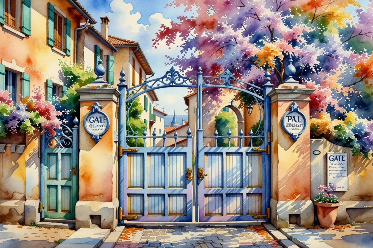 gate, Paul Signac style, HD, sharp focus, stunningly beautiful, hyper-detailed, Watercolor style painting, visible paper texture, colorwash, watercolor