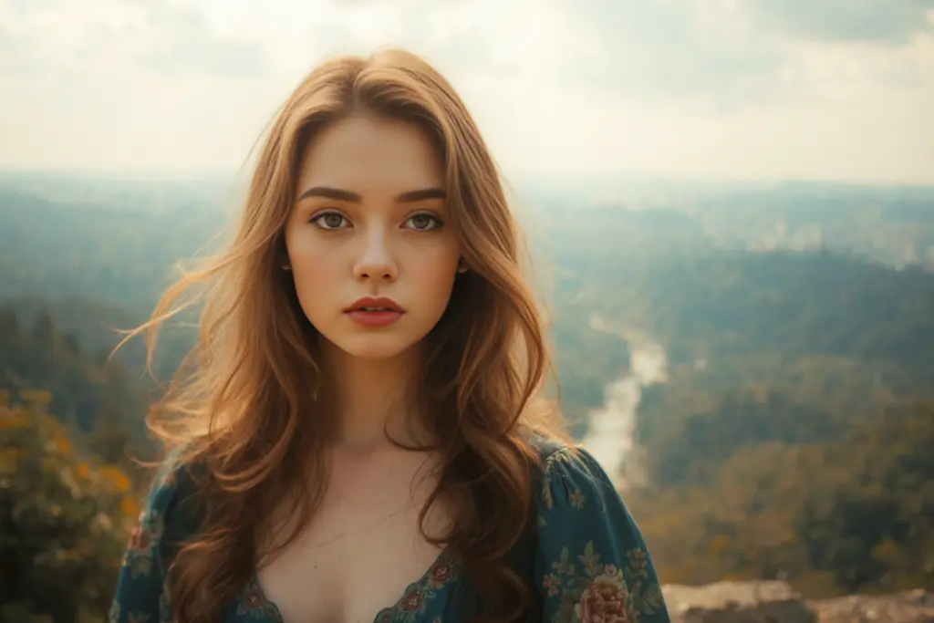 young woman, beautiful face, great body, gorgeous figure, long legs, pretty eyes, long hair, great bust, beautiful background, magnificent scenery, Roy Lichtenstein style, HD, sharp focus, stunningly beautiful, alien-themed, extraterrestrial, cosmic, otherworldly, mysterious, sci-fi, highly detailed