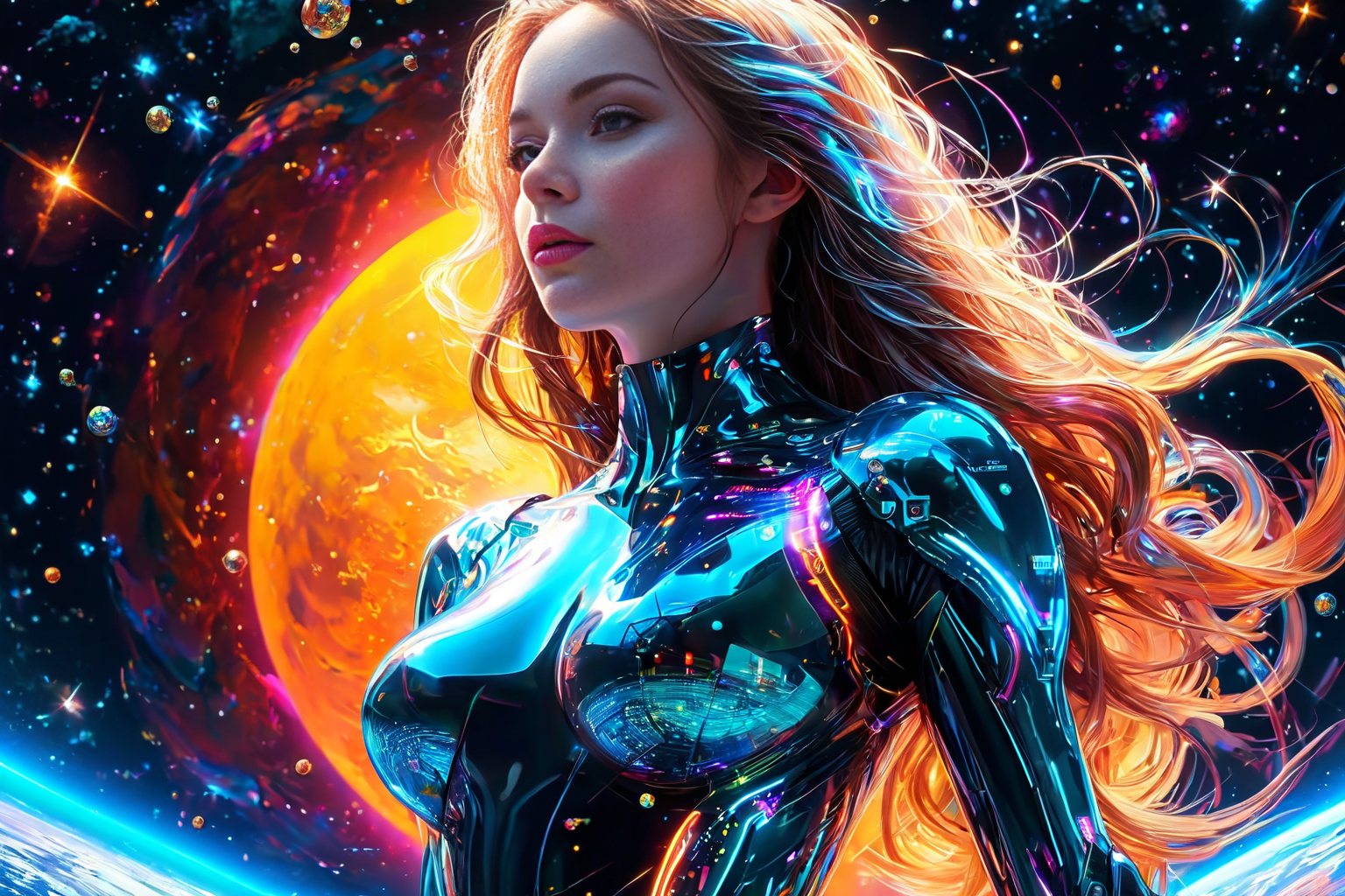 young woman, beautiful face, standing, great body, gorgeous figure, long legs, pretty eyes, long hair, INI style, beautiful background, magnificent scenery, Valentin Serov style, HD, sharp focus, stunningly beautiful, hologram floating in space, a vibrant digital illustration, dribbble, quantum wavetracing, black background, behance hd