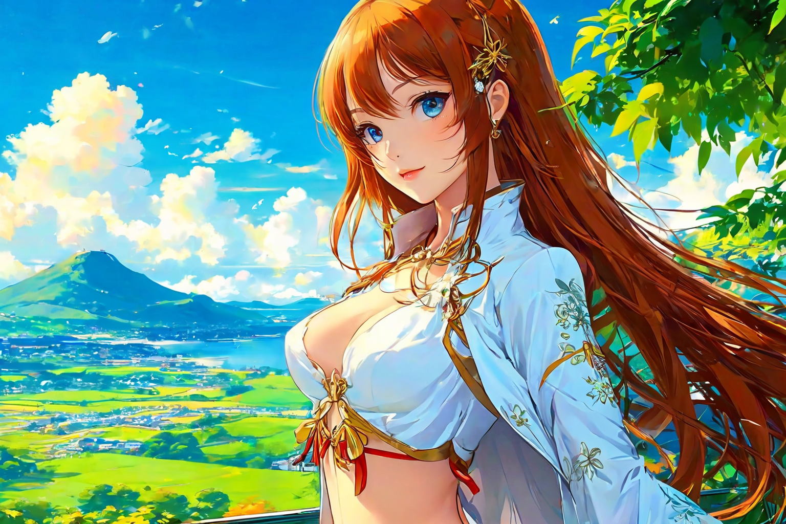 young woman, beautiful face, standing, great body, gorgeous figure, long legs, pretty eyes, long hair, Luit Linux distribution style, beautiful background, magnificent scenery, Marcel Duchamp style, HD, sharp focus, stunningly beautiful, anime artwork, anime style, key visual, vibrant, studio anime, highly detailed