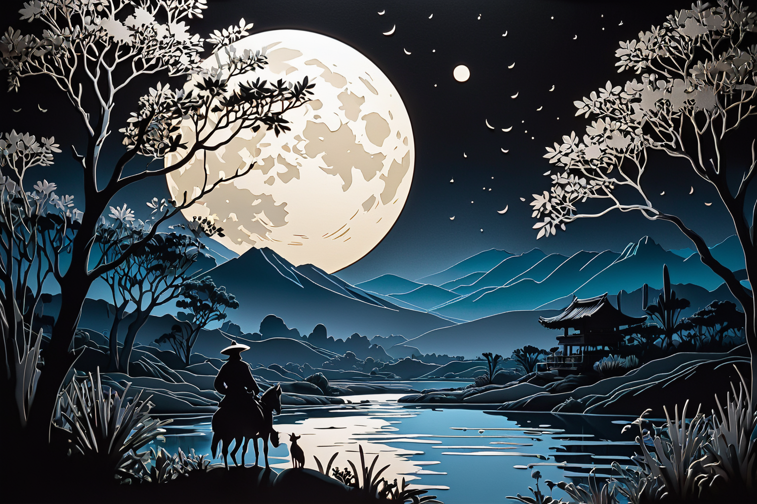 “In this postmodern splash painting by Diego Velázquez, we witness a serene night scene in Indonesia. The weather is sunshine, casting an ethereal glow on the surroundings. Amidst the tranquil landscape stands a towering Flannel Bush illuminated by a full moon. A pair of mystical beings with glowing eyes observe the scenery from above, their presence hinting at an unearthly narrative unfolding in the background.”