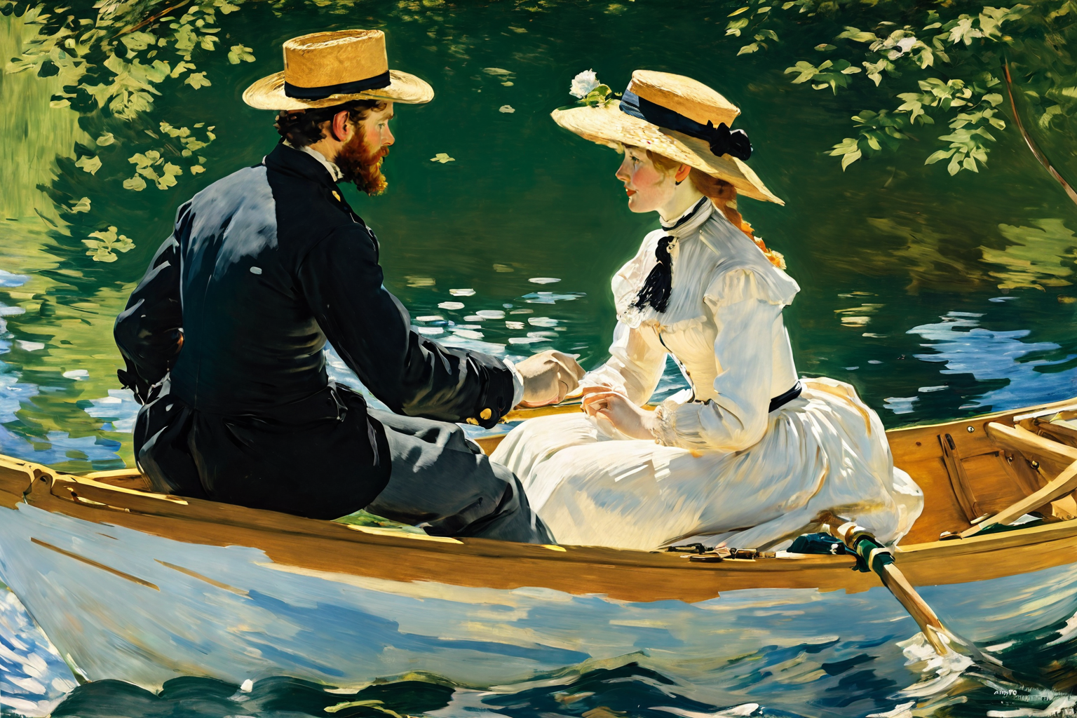 “Boating” by Édouard Manet, painted in 1866, depicts a seemingly casual scene of a bourgeois couple on a pleasure cruise. However, Manet’s unconventional use of light and shadow, combined with the couple’s ambiguous gazes, challenges traditional academic painting conventions of the time. It’s considered a key work in the shift towards modernism in Impressionism.