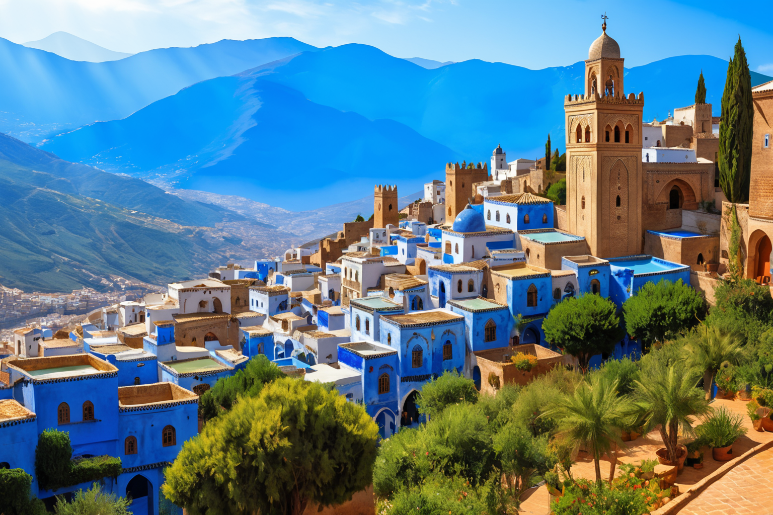 Chefchaouen Morocco, Marcel Duchamp style, Chefchaouen, Morocco, buildings, blue paint, warm sunlight, magical quality, charm, Andalusian style, medina. HD, sharp focus, stunningly beautiful, Neo-Baroque, ornate and elaborate, dynaimc, Neo-Baroque