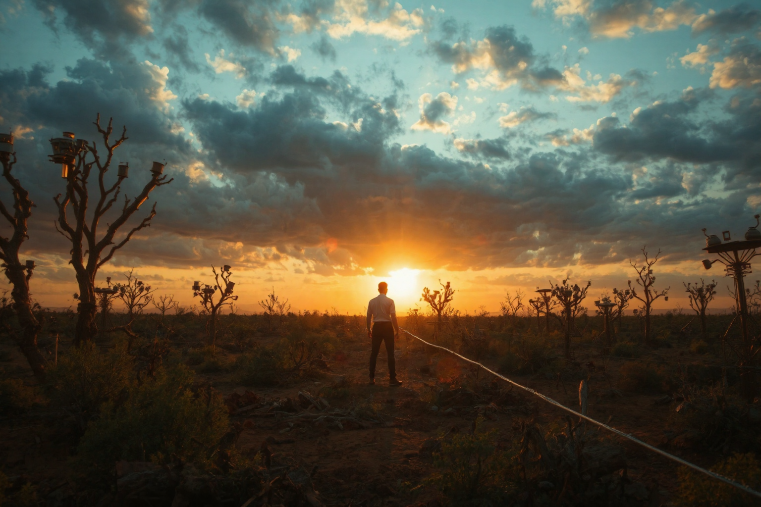 Create a neoplastic artwork inspired by Filipp Malyavin’s Pulling and Scrapping technique, depicting a futuristic sunrise over the Australian outback. The scene is bathed in a soft, muted light as the sun peeks over the horizon, casting long shadows across the rugged landscape. Thick clouds hang low, almost touching the parched earth, adding to the mysterious atmosphere. In the foreground, a solitary figure appears, their silhouette distorted by the scrap metal and wires that surround them, symbolizing the human connection to nature even in this futuristic setting. Tall, angular trees with distinctive shapes dot the horizon, their branches reaching towards the sky like metallic sculptures. A sense of movement is suggested by the scattered debris—rusted machinery, broken tools, and tangled wires—as if a recent struggle or transformation had taken place. The overall composition captures the raw beauty of Australia’s future, blending nature and technology in a unique, abstract style.