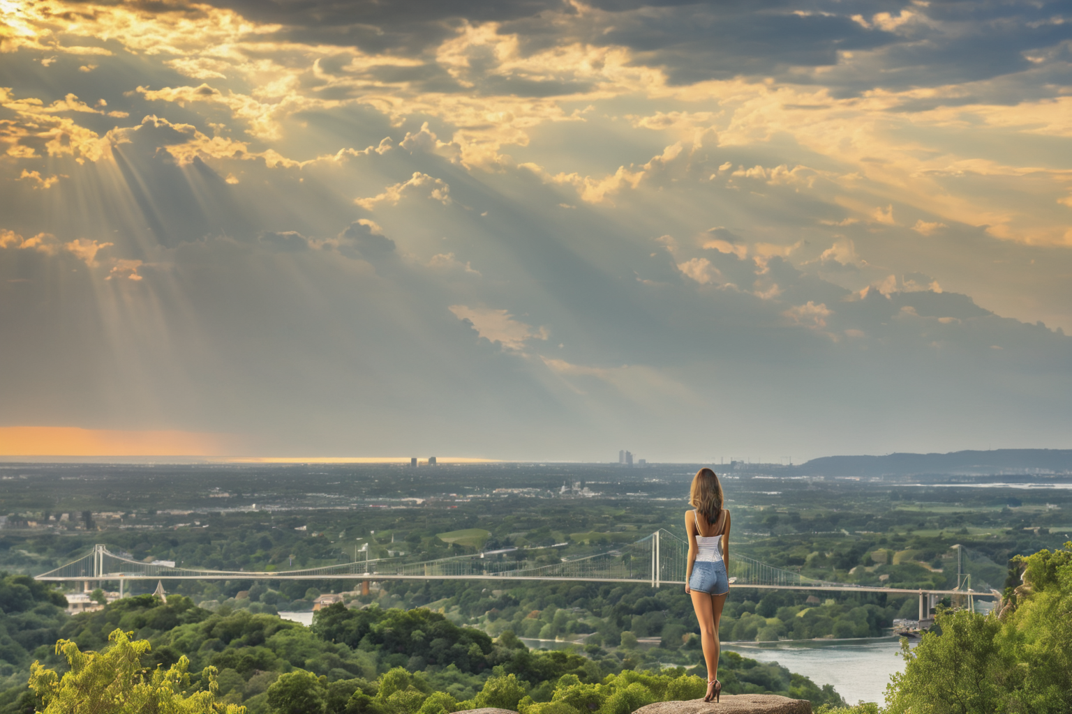 young woman, beautiful face, standing, great body, gorgeous figure, long legs, pretty eyes, long hair, BOB Gateway Bridged USDC (BOB Network) style, beautiful background, magnificent scenery, Georges Seurat style, HD, sharp focus, stunningly beautiful, long shot scenic professional photograph of perfect viewpoint, highly detailed, wide-angle lens, hyper realistic, with dramatic sky, polarizing filter, natural lighting, vivid colors, everything in sharp focus, HDR, UHD, 64K
