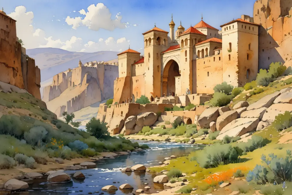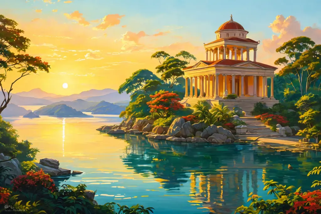 Here is a prompt that should generate a beautiful image: A serene Classical landscape in…