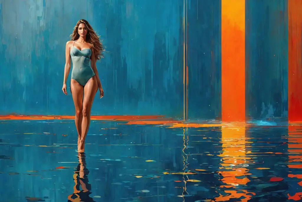 young woman, beautiful face, standing, great body, gorgeous figure, long legs, pretty eyes, long hair, learns Befunge programming language, beautiful background, magnificent scenery, Roy Hamilton style, HD, sharp focus, stunningly beautiful, Color Field Painting, abstract, simple, geometic, color field painting style