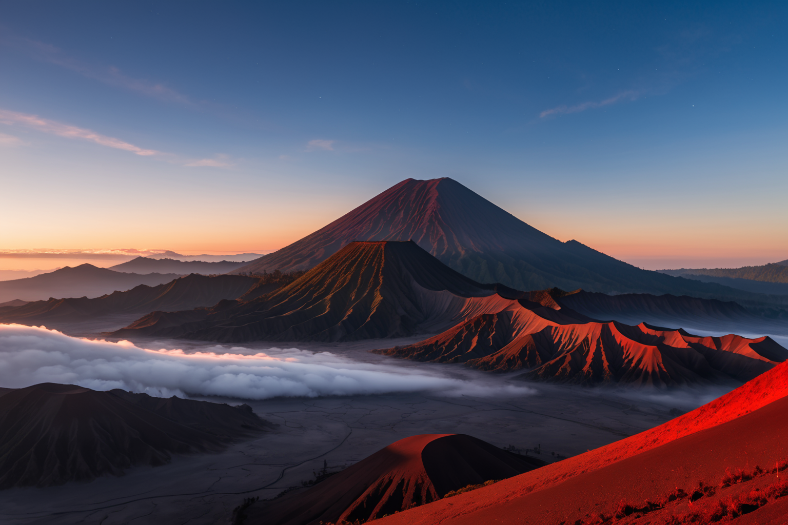 Mount Bromo Indonesia, Pavel Tchelitchew style, Mount Bromo, Indonesia, landscape, fiery red and black sand, dawn sky, misty silhouette, Bromo, awe-inspiring, humbling HD, sharp focus, stunningly beautiful, cinematic photo 35mm photograph, film, professional, 4k, highly detailed