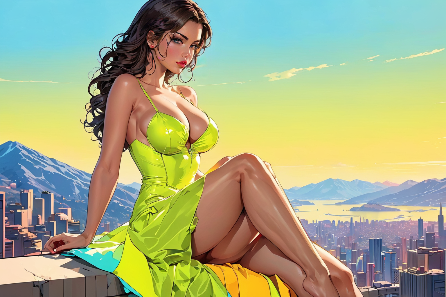 young woman, beautiful face, great body, gorgeous figure, long legs, pretty eyes, long hair, great bust, beautiful background, magnificent scenery, Hector Guimard style, HD, sharp focus, stunningly beautiful, GTA-style artwork, satirical, exaggerated, pop art style, vibrant colors, iconic characters, action-packed