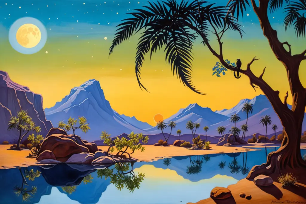 Create a captivating still life drawing inspired by Nicholas Roerich’s style, set in ancient Libya…