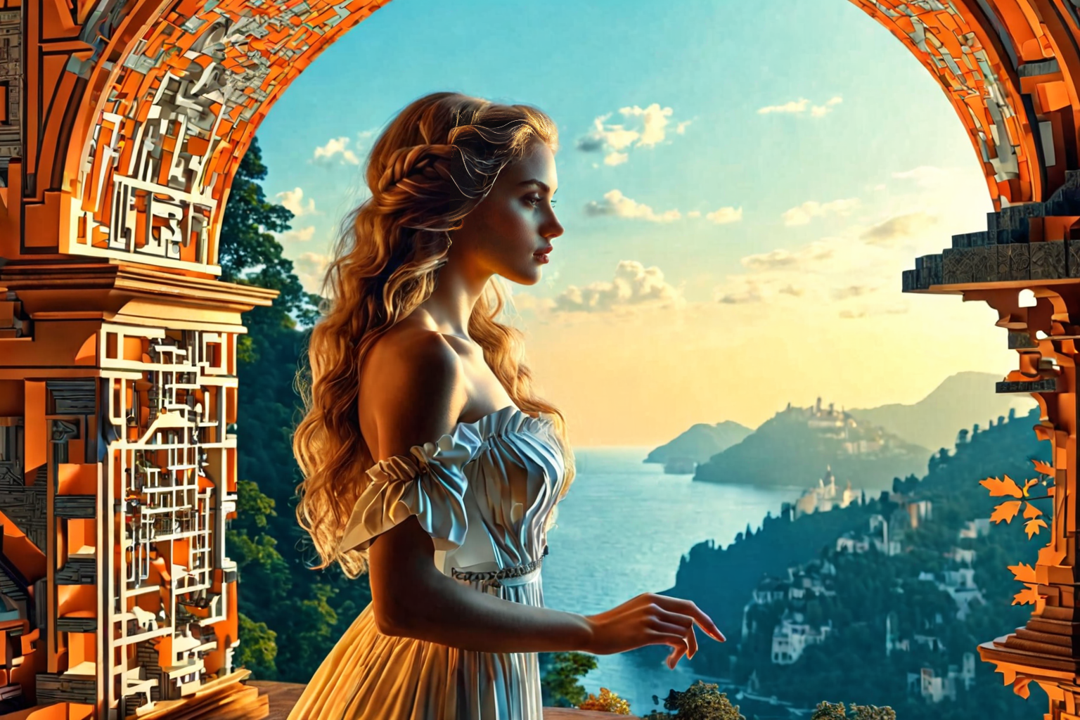 young woman, beautiful face, standing, great body, gorgeous figure, long legs, pretty eyes, long hair, learns Escher programming language, beautiful background, magnificent scenery, Angelica Kauffmann style, HD, sharp focus, stunningly beautiful, thick layered papercut art of, deep 3D, volumetric, dimensional, depth, thick paper, high stack, heavy texture, tangible layers