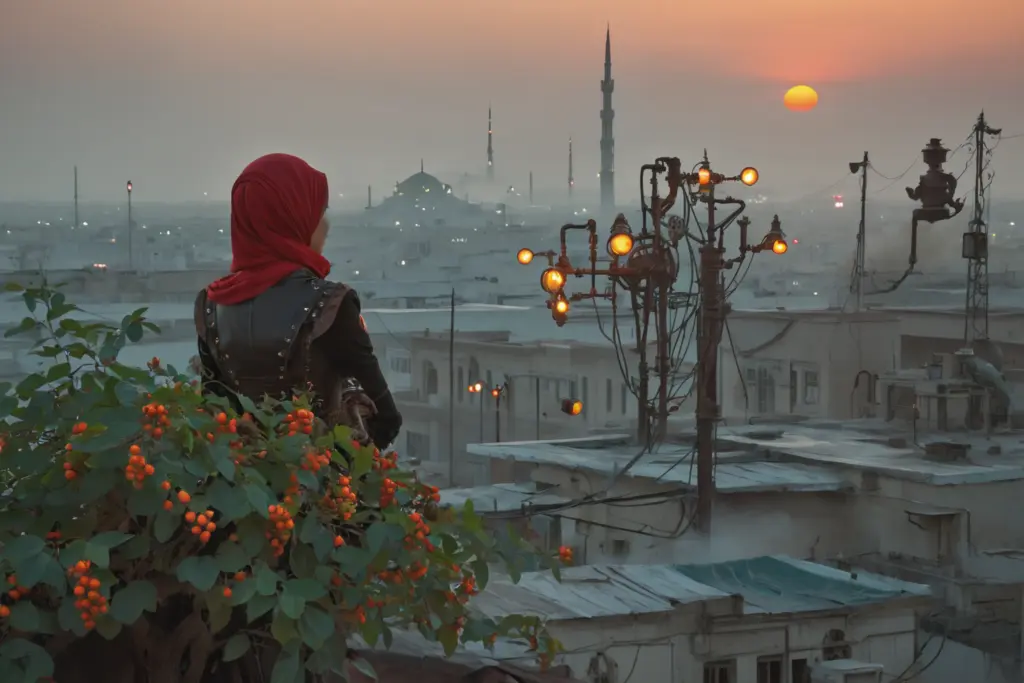 ”In this splash painting, we see a quiet street in Turkmenistan at dusk in the…