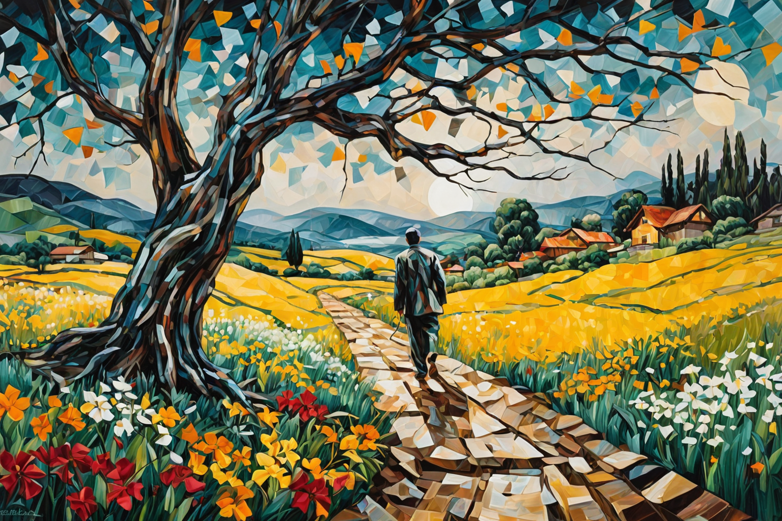 In this South Korean evening scene during a hail storm, the artist’s interpretation of Neoplasticism merges with the Oil Painting technique by Georges Braque. The atmosphere is filled with intensity and melancholy as a group of people gathers under the shelter of trees alongside a rural pathway. A solitary figure gazes out into the distance, reflecting on life amidst the falling hailstones. The landscape consists of rustic homes, lush fields, and twisted branches intertwined with delicate flowers, showcasing an emotional connection between man and nature as a woodworm gently carves its way through time-honored structures.