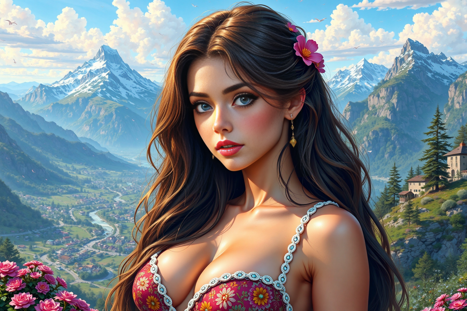 young woman, beautiful face, great body, gorgeous figure, long legs, pretty eyes, long hair, great bust, beautiful background, magnificent scenery, Simon Ushakov style, HD, sharp focus, stunningly beautiful, retro game art, 16-bit, vibrant colors, pixelated, nostalgic, charming, fun