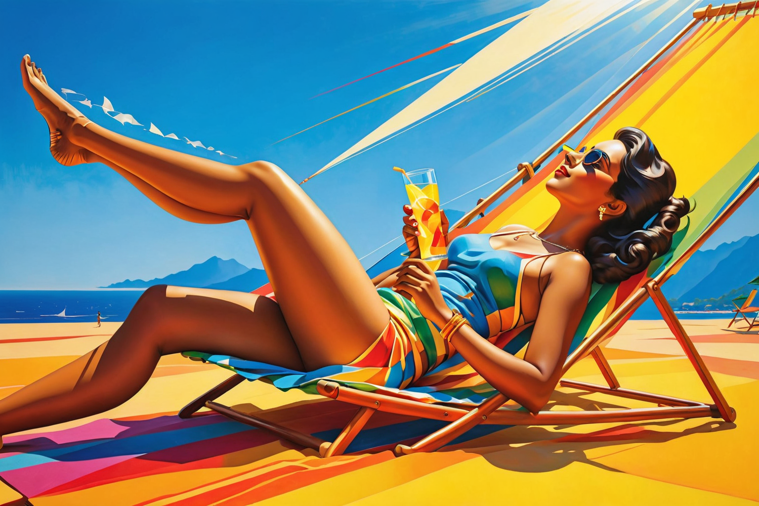 Kattirippulam, India, Giacomo Balla style, bright, sunny, temperature, soaring, heat, outdoor activities, lounging, warm, sun, hydrated, skin, rays HD, sharp focus, stunningly beautiful, Pop Art style, bright colors, bold outlines, popular culture themes, ironic or kitsch