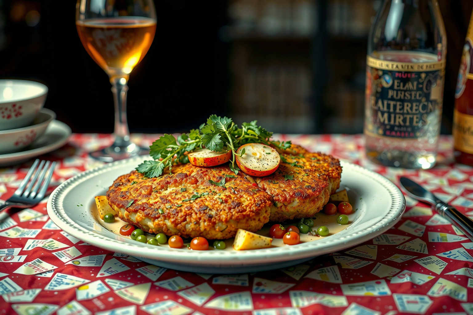 Wiener schnitzel dish , Robert Rauschenberg style, HD, sharp focus, stunningly beautiful, Avant-garde, unusual, experimental, avant-garde art