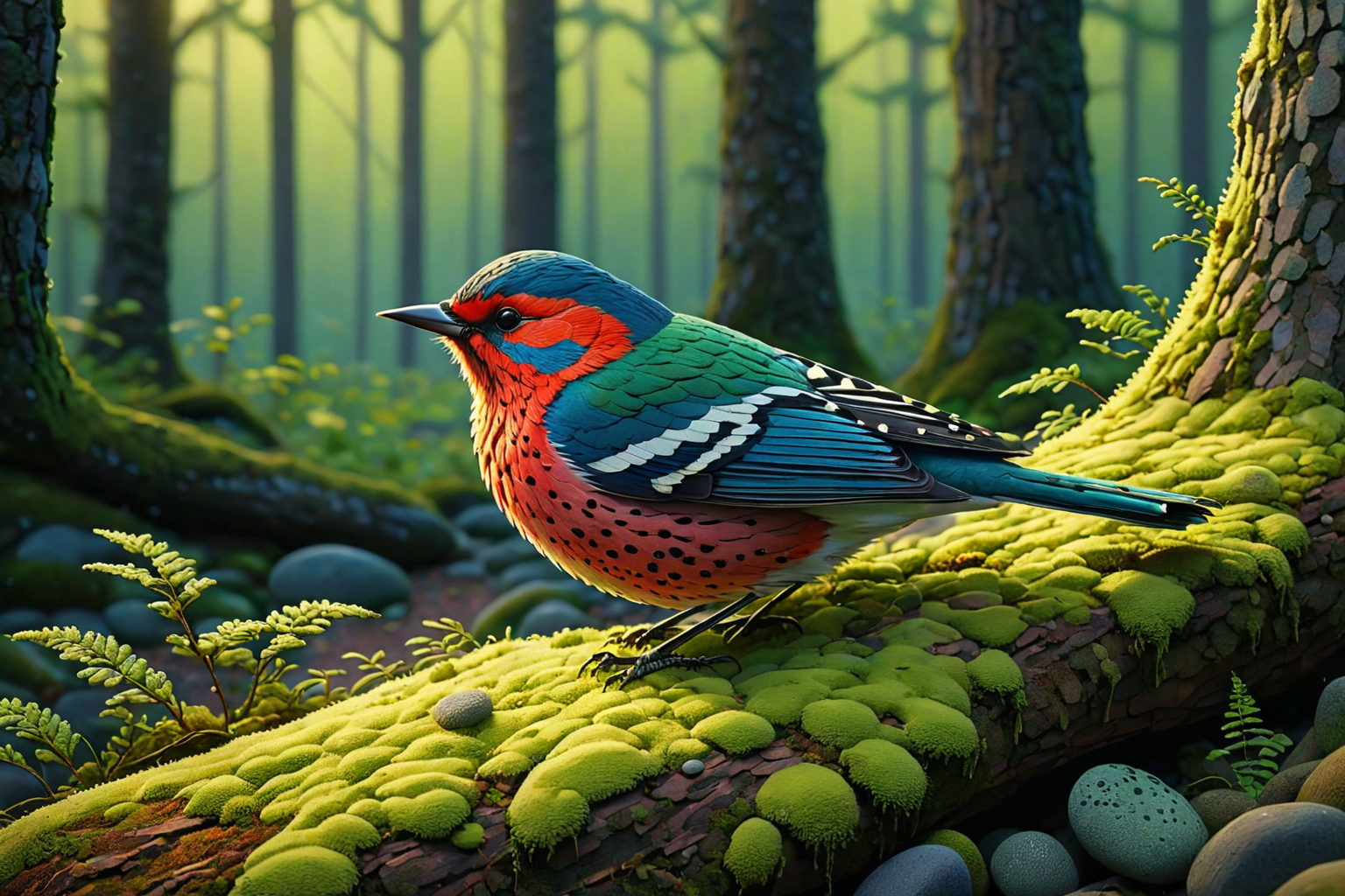 Olga Chernysheva style, Woods, shadows, twilight, song, melancholy birds, dirge, peaceful, mossy stones, brooks, calm repose, fading light, nature, ode, vows, quiet moment, hope, sleep, renewed, love, comfort, boughs, shelter, seek, solace HD, sharp focus, stunningly beautiful, pointillism style, composed entirely of small, distinct dots of color, vibrant, highly detailed