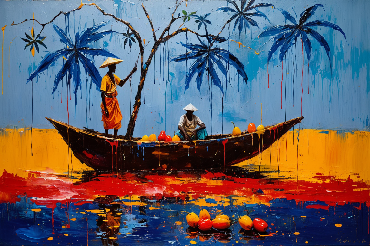 The picture takes place in The Gambia at night in the present. The weather is heavy, torrential rains, illuminated by flickering, amber-colored streetlights. A lone, weathered Cinnamomum tree dominates the foreground, its branches dripping with water and casting distorted shadows. Beneath the tree, a dark-skinned man in a simple, indigo-dyed shirt and trousers sits on a wooden crate, meticulously painting a vibrant, abstracted scene of a bustling market ā influenced by Cloisonism ā using spray painting techniques. The market scene is bursting with color: scarlet peppers, golden mangoes, and deep indigo fabrics. There are a few stray dogs sheltering under the crate, their eyes reflecting the light. In the distance, a small, brightly colored fishing boat struggles against the current. The overall mood is melancholic yet full of raw, energetic color. Genre: Cloisonism in Spray Painting technique by artist Adolph Gottlieb.