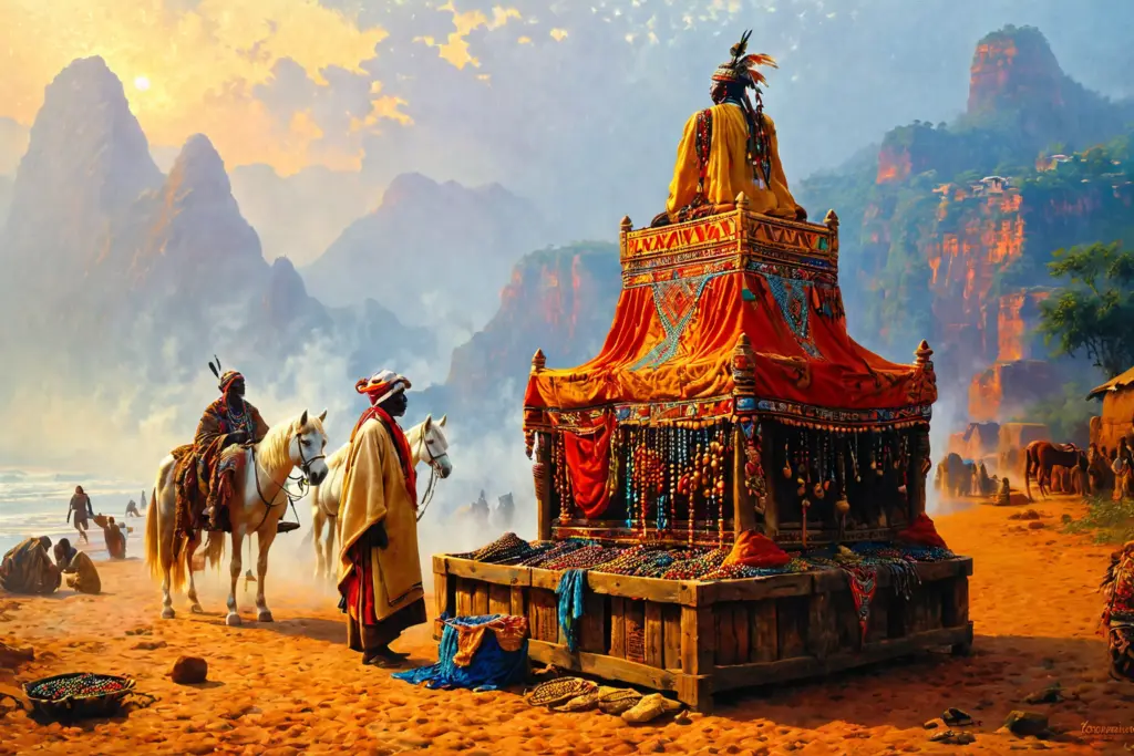Here is the prompt: A futuristic market scene unfolds in Guinea at dawn, partially cloudy…