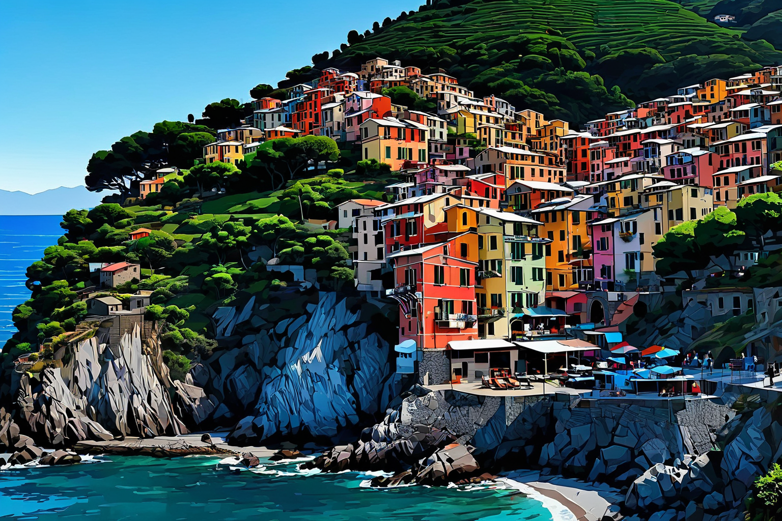 Cinque Terre Italy, Alexander Melamid style, Italy, Cinque Terre, houses, cliffsides, coastal views, breathtaking, experience, memorable, vibrant, charming, scenic HD, sharp focus, stunningly beautiful, Vector art, Vivid colors, Clean lines, Sharp edges, Minimalist, Precise geometry, Simplistic, Smooth curves, Bold outlines, Crisp shapes, Flat colors, Illustration art piece, High contrast shadows, Technical illustration, Graphic design, Vector graphics, High contrast, Precision artwork, Linear compositions, Scalable artwork, Digital art