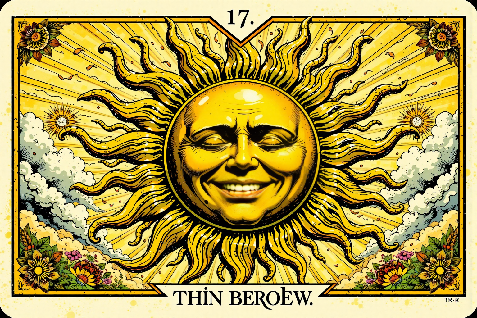 The Sun Tarot card, Adolph Gottlieb style, Sun, joy, happiness, positivity, success, fulfillment, achievement, good news, opportunities, positive energy, brightness, life, recognition, hard work, confidence, self-esteem, growth, personal goals, professional goals, enjoyment, bask, sunshine, spread joy HD, sharp focus, stunningly beautiful, Neo-Rococo, curved forms, naturalistic ornamentation, elaborate, decorative, gaudy, Neo-Rococo