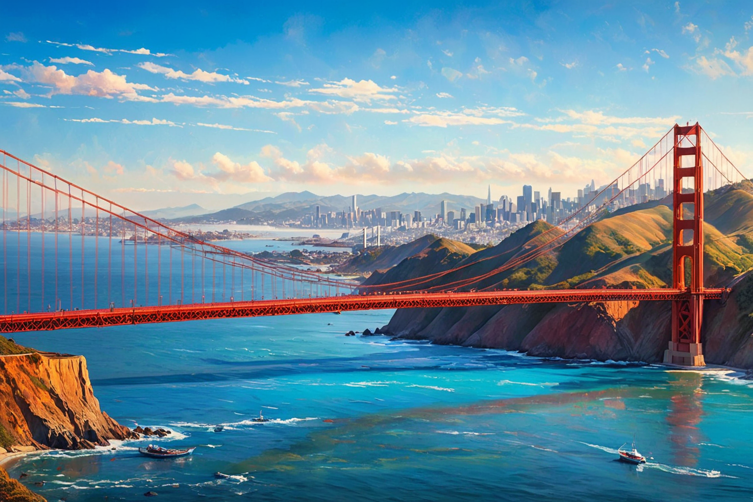 Golden Gate Bridge USA, John Constable style, Golden Gate Bridge, USA, scale, vibrant red, blue water, breathtaking, unforgettable sight HD, sharp focus, stunningly beautiful, Advertising poster style, Professional, modern, product-focused, commercial, eye-catching, highly detailed