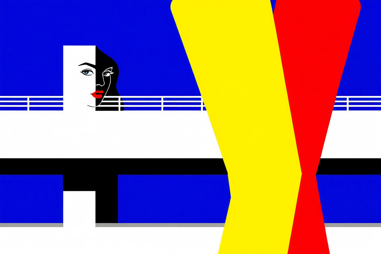 young woman, beautiful face, standing, great body, gorgeous figure, long legs, pretty eyes, long hair, learns Oriel programming language, beautiful background, magnificent scenery, J. M. W. Turner style, HD, sharp focus, stunningly beautiful, Bauhaus-Style Poster, simple geometric shapes, clean lines, primary colors, Bauhaus-Style Poster