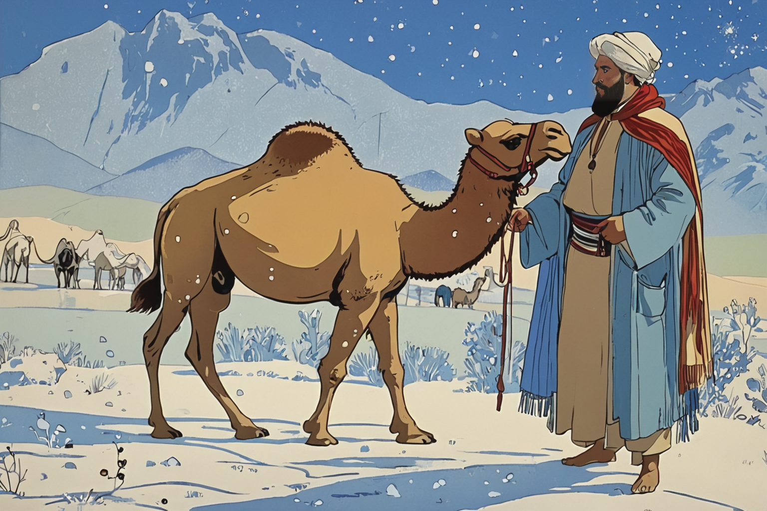 The picture takes place in Chad at morning in the not long ago. The weather is chilly, with a light frost dusting the ochre earth. A young Bedouin man, clad in a richly embroidered crimson and gold cloak, sits cross-legged beside a small, intricately carved wooden stall overflowing with vibrant Actinidia berries and dates. He’s carefully examining a hand-woven rug displayed on the stall. In the background, a small herd of Bactrian camels, their shaggy coats shimmering in the dawn light, graze peacefully. The style is Graphics in Glass Painting technique by artist Boris Kustodiev, emphasizing sharp lines, layered colors, and a sense of shimmering detail.