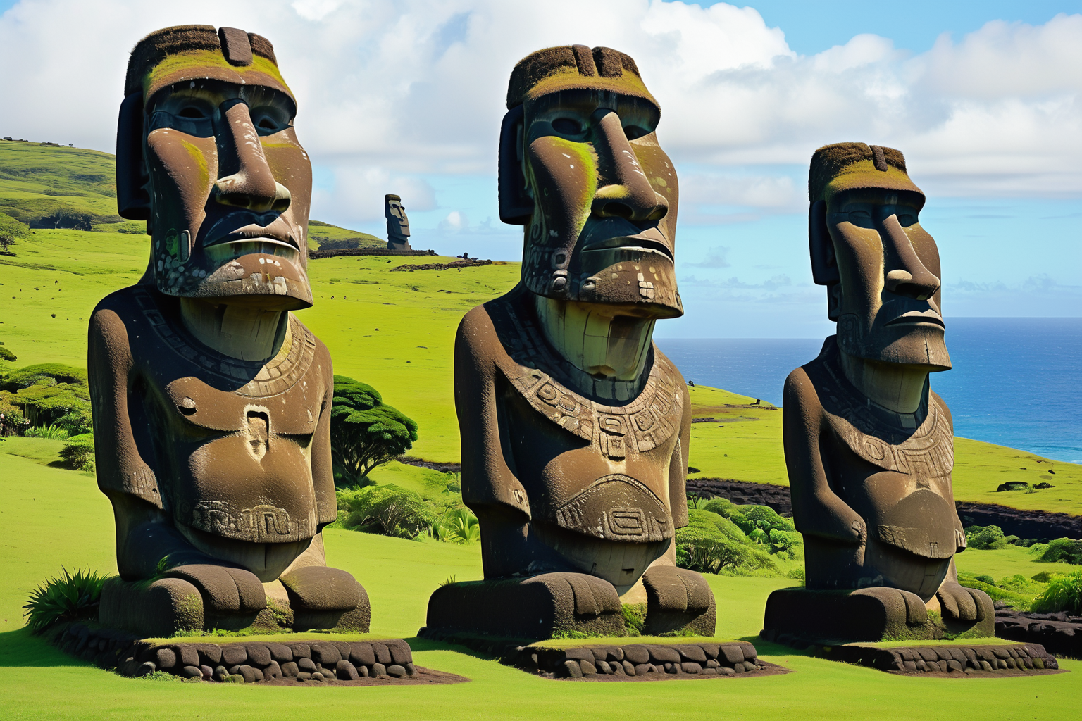 Rapa Nui Chile, Diego Velázquez style, Rapa Nui, Chile, ancient Moai statues, eerie silence, lush green landscapes, secrets, isolation, paradise, breathtaking beauty, awe, tiny, greater than myself HD, sharp focus, stunningly beautiful, Rococo, flamboyant, pastel colors, curved lines, elaborate detail, Rococo