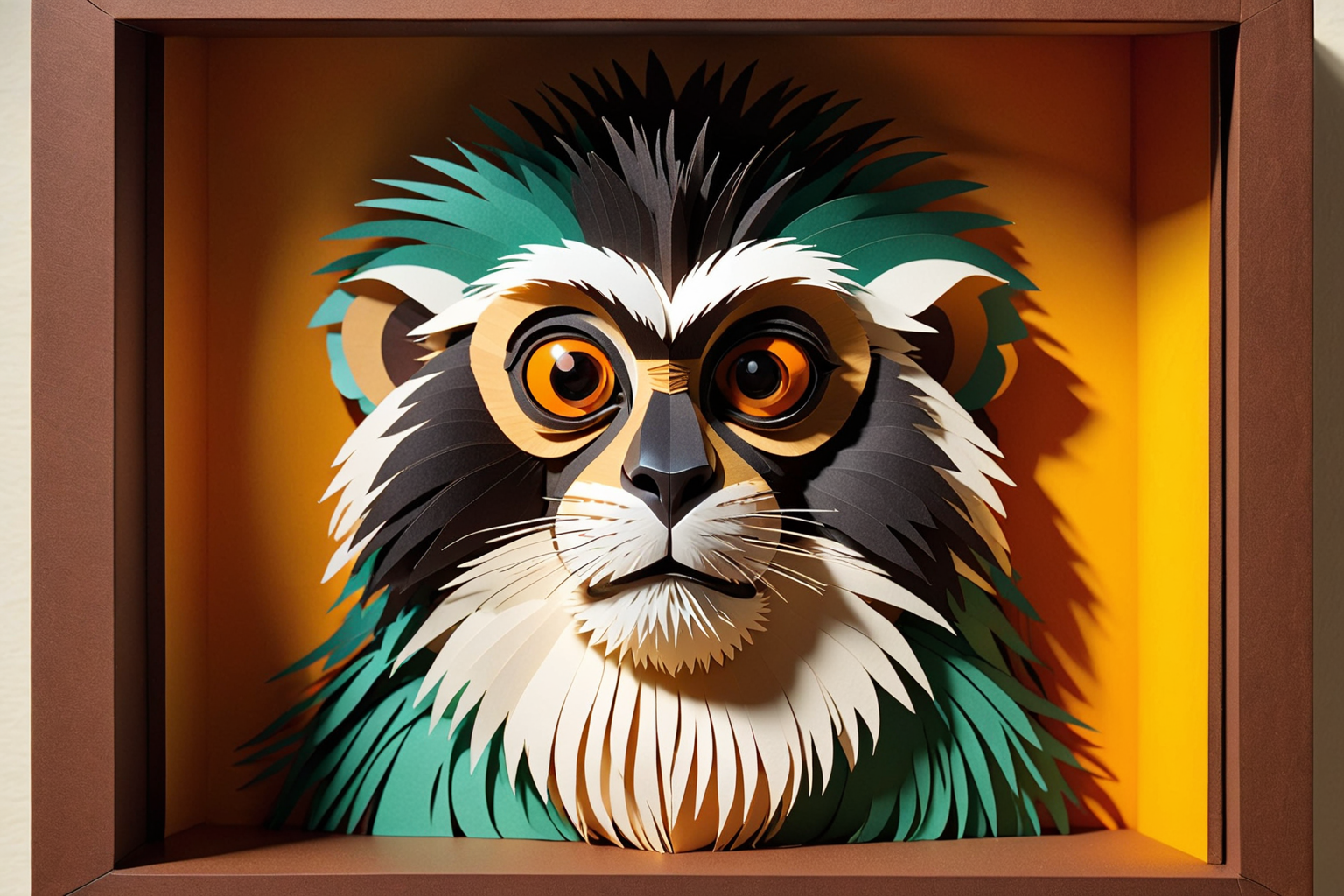 Tamarin, Kurt Schwitters style, HD, sharp focus, stunningly beautiful, 3D papercut shadow box of, layered, dimensional, depth, silhouette, shadow, papercut, handmade, high contrast