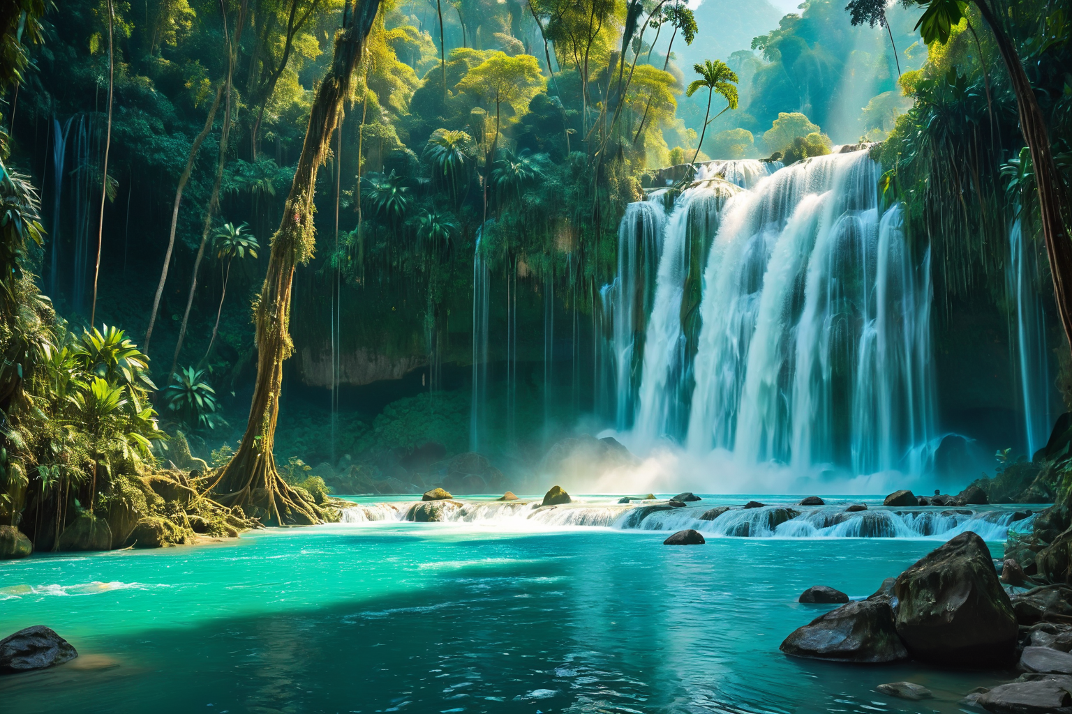 Kuang Si Falls Laos, Alphonse Mucha style, falls, laos, mesmerizing, cascade, water, pools, turquoise, jungle, backdrop, experience, unforgettable HD, sharp focus, stunningly beautiful, space-themed, cosmic, celestial, stars, galaxies, nebulas, planets, science fiction, highly detailed