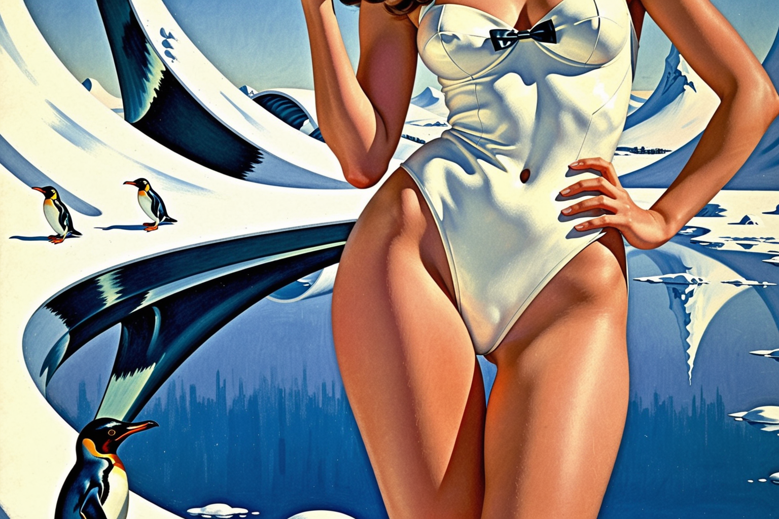 young woman, beautiful face, standing, great body, gorgeous figure, long legs, pretty eyes, long hair, Penguin Sleuth Linux distribution style, beautiful background, magnificent scenery, Boris Kustodiev style, HD, sharp focus, stunningly beautiful, Googie Art Style, dynamic, dramatic, 1950’s futurism, bold boomerang angles, Googie art style