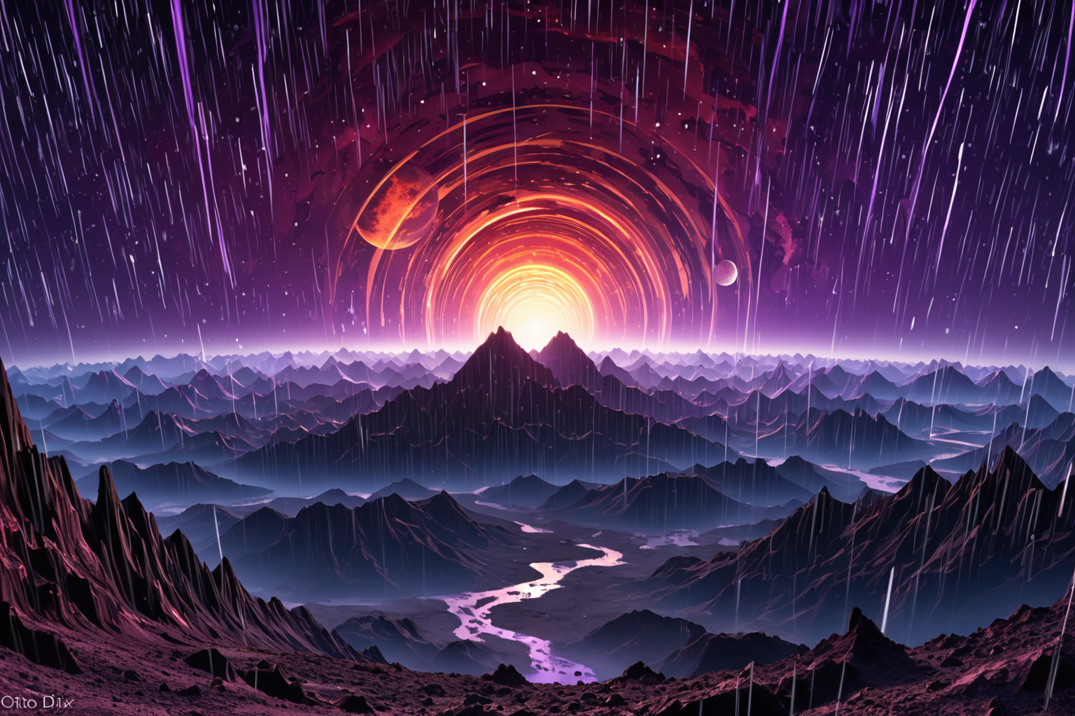 Kepler-1392 b exoplanet, Otto Dix style, exoplanet, Kepler-1392 b, weather, atmospheric pressure, temperature, rain showers, methane, ammonia, sky, light, purple, star, geology, volcanic activity HD, sharp focus, stunningly beautiful, thick layered papercut art of, deep 3D, volumetric, dimensional, depth, thick paper, high stack, heavy texture, tangible layers