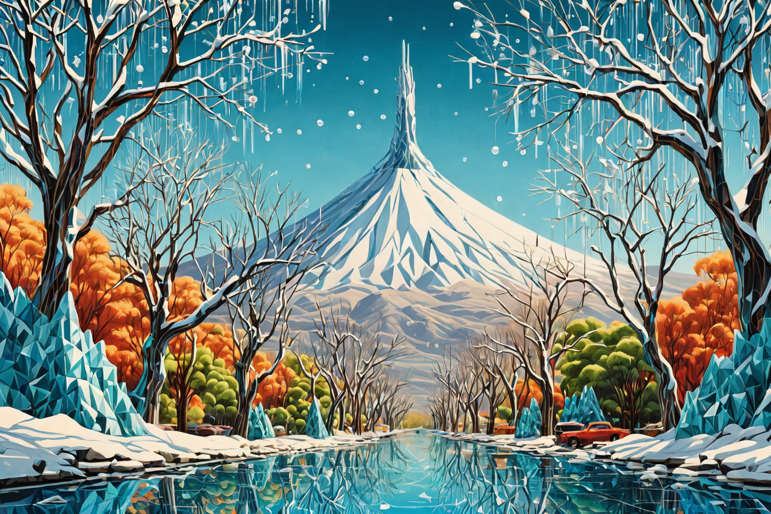 A futuristic cityscape in El Salvador, set amidst snow-covered volcanoes at high noon, with buildings resembling geometric sculptures by Vladimir Weisberg. The city’s architecture blends seamlessly with lush gum trees, their twisted branches heavy with crystallized water droplets and icicles. In the foreground, a school of iridescent fish swim through a frozen canal, surrounded by vibrant turquoise tiles and sleek modernist statues of abstracted animal forms. The atmosphere is surreal, yet harmonious, as snowflakes gently fall amidst a symphony of color and texture.