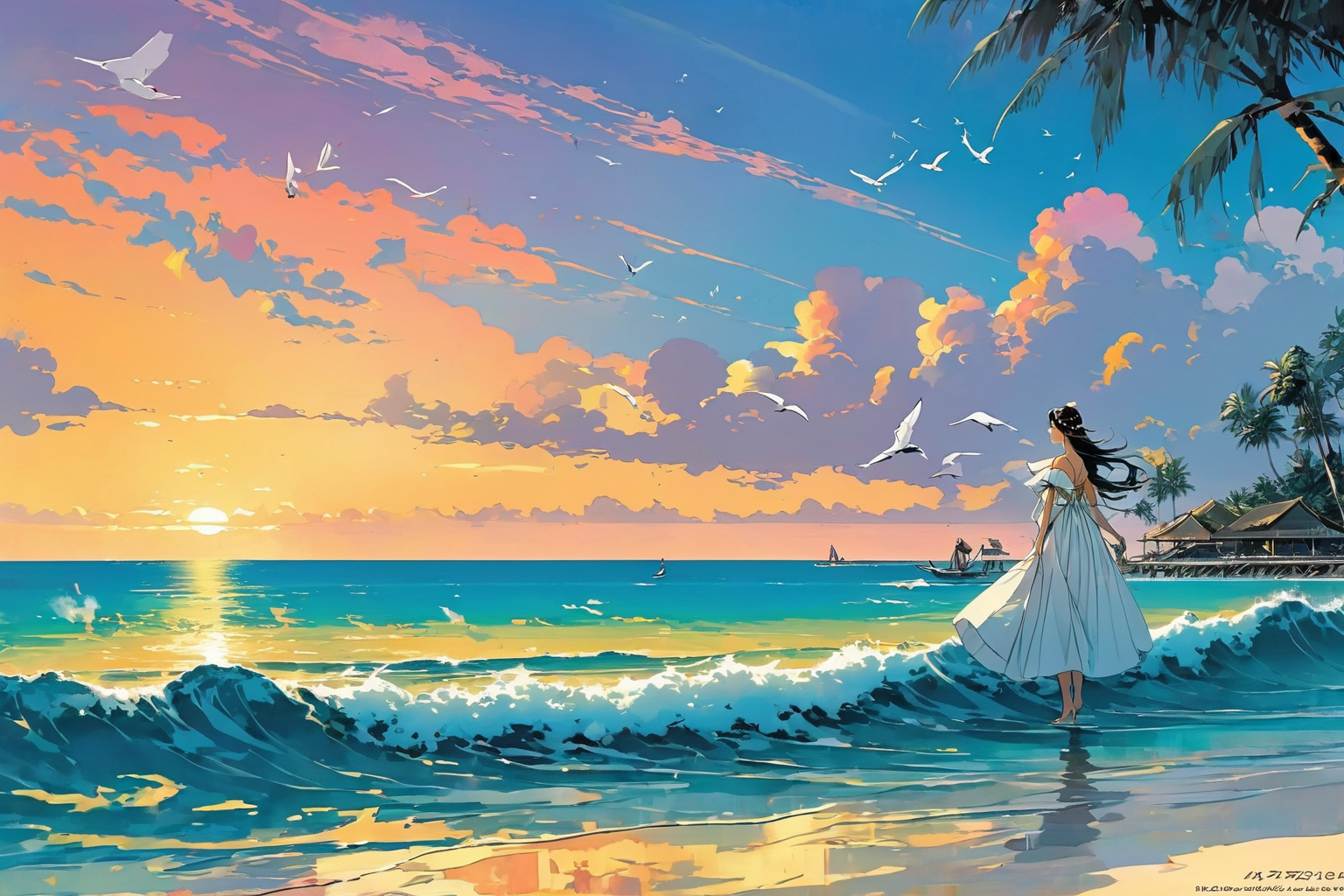 In this harmonious futuristic Maldives setting at dawn, the sky blends with various hues of rainbow colors, creating an atmospheric effect. As a tribute to the Proto-Renaissance era, Splash Painting is utilized by renowned artist Francisco Infante. The scene depicts a tranquil beach where gentle waves crash, revealing intricate designs from the Japanese Kerria bushes that flourish nearby. A serene woman, clad in elegant attire, walks along the shoreline with grace as she observes the spectacular view and her surroundings; birds gracefully soar across the sky, creating an ethereal backdrop for the scene.