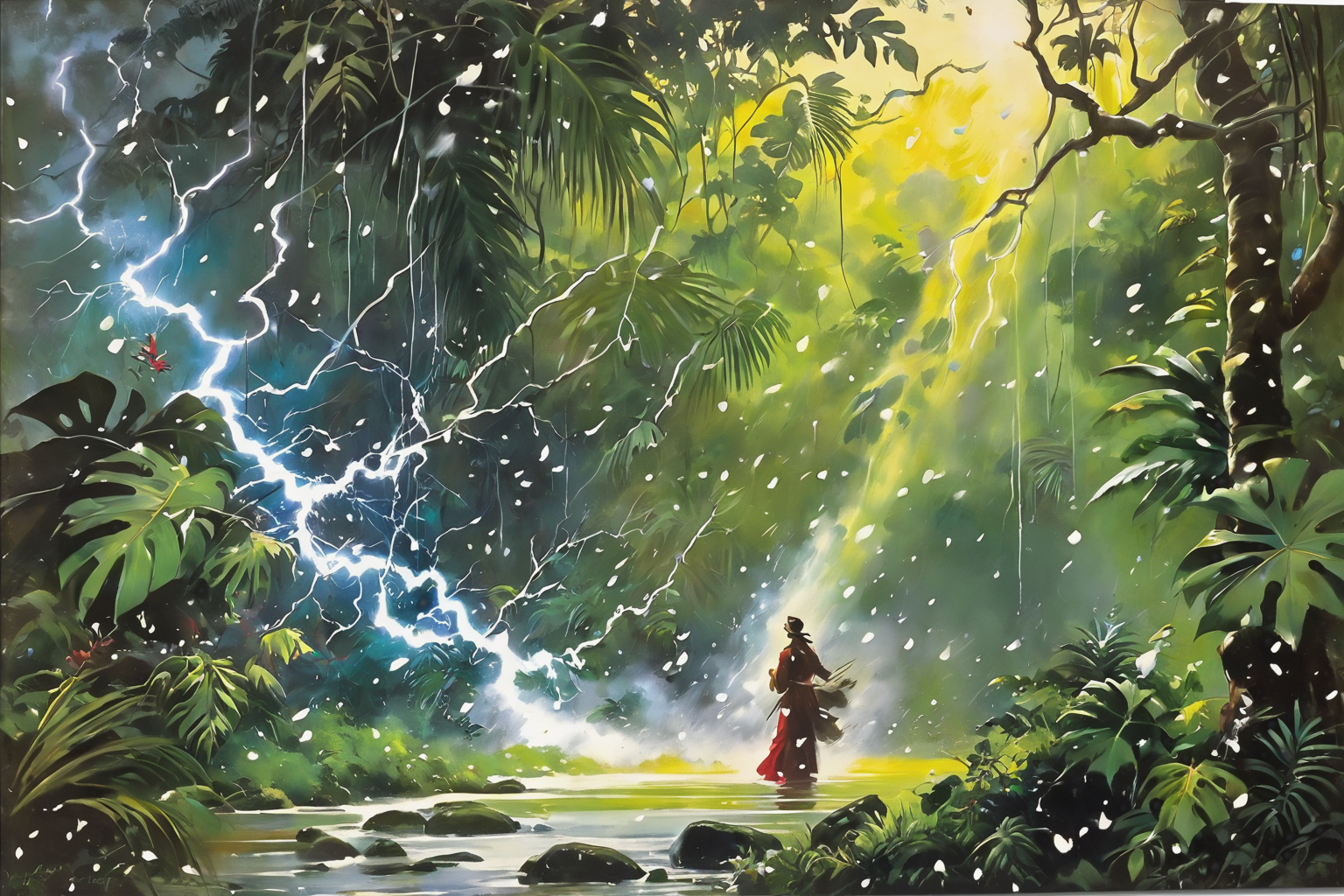 Create an evocative postmodernist encaustic painting set in a past evening in Brazil during a thundersnow. In the foreground, a lone figure, dressed in traditional Brazilian attire, stands amidst a swirling vortex of snowflakes and lightning bolts. Behind them, the vibrant Amazon rainforest is visible through the storm, its lush greenery contrasting starkly with the whiteout. A pair of Swampprivets, their feathers glistening with moisture, perch on a nearby branch, adding a touch of life to this eerie scene. The artist’s style echoes John Singer Sargent’s masterful use of light and shadow, capturing the dramatic atmosphere of this unusual weather event.