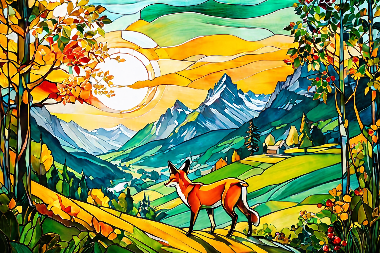 The picture takes place in Switzerland at sunrise in the long-long ago. The weather is hot, with golden sunlight casting long shadows on the landscape. In the foreground, a group of stylized animals in animalistics style interact playfully, including a fox, deer, and rabbit. Above them, an ethereal woman with flowing hair and dressed in classical attire observes the scene, her presence adding a mystical element to the composition. The background features a mountain range with peaks gently glowing under the morning light. The drawing technique is in pencil color, reminiscent of Max Beckmann’s style, with bold outlines and subtle shading. Pistache green hues accentuate the foliage, creating a vibrant yet serene atmosphere.