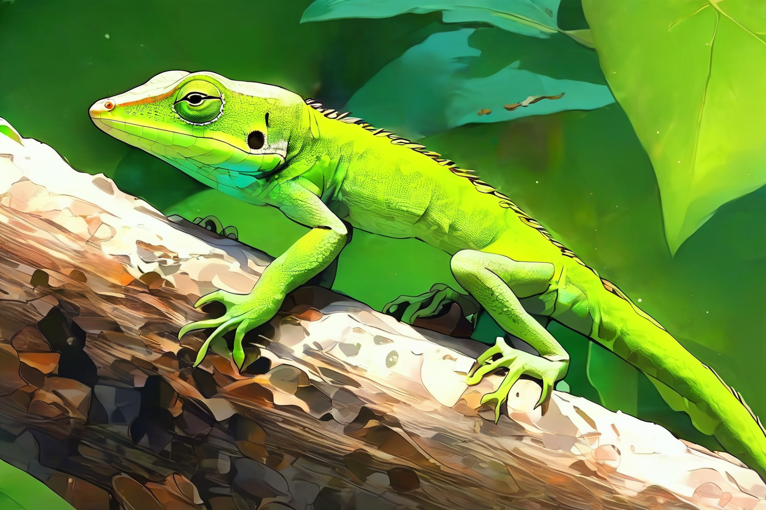 Green Anole, Antonio Gaudí style, HD, sharp focus, stunningly beautiful, anime artwork, anime style, key visual, vibrant, studio anime, highly detailed