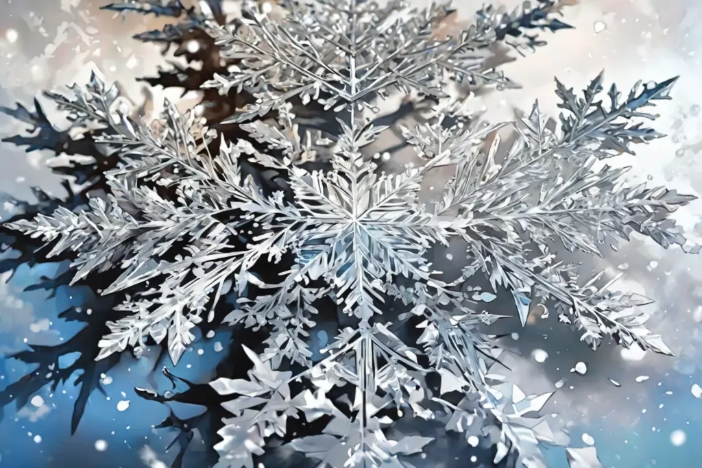 Snowflake, centered, close up, Marc Chagall style, HD, sharp focus, stunningly beautiful, High Fashion, dynamic, dramatic, haute couture, elegant, ornate clothing, High Fashion