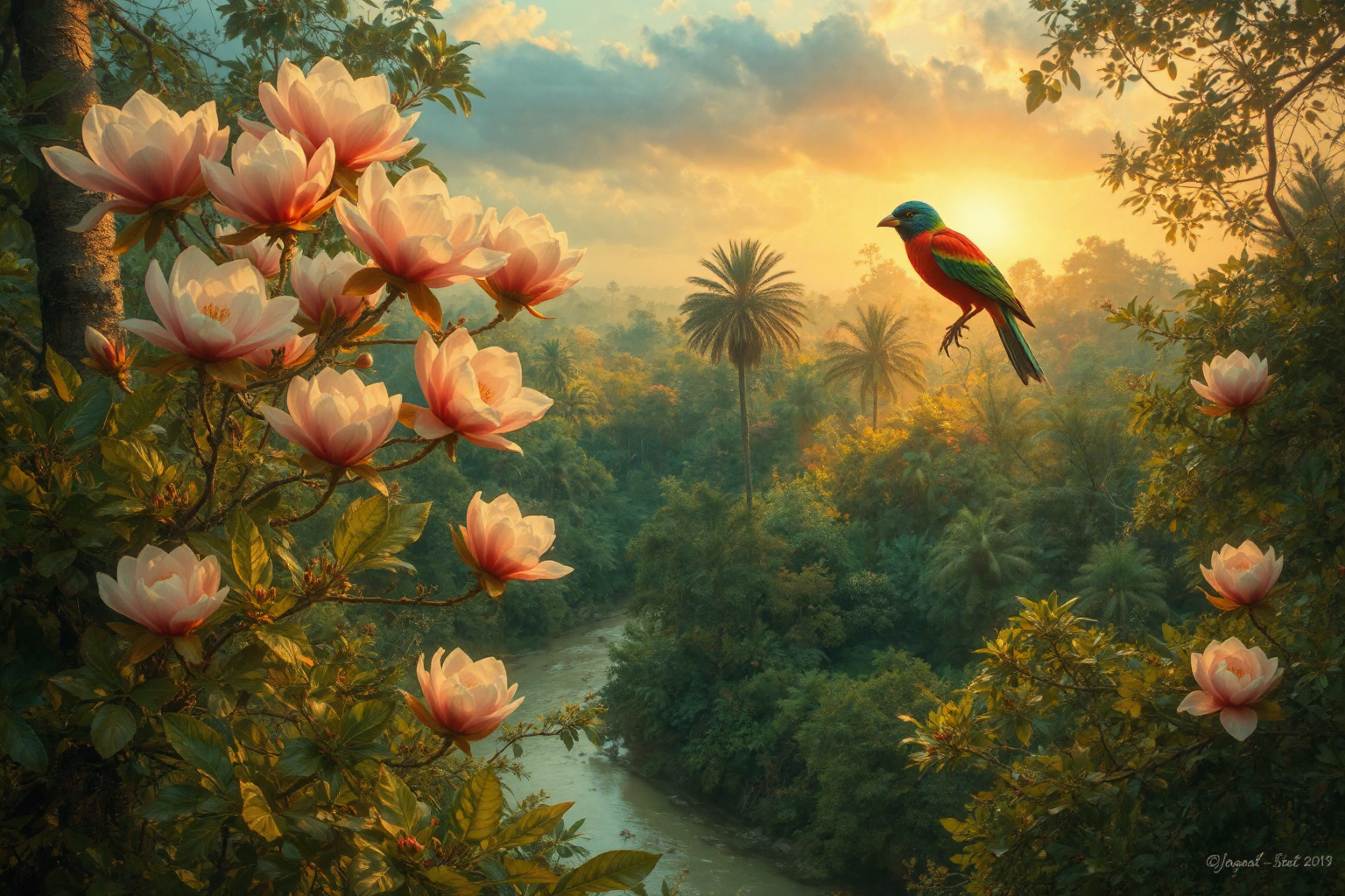 Create a captivating canvas painting in the style of Gustav Klimt’s Gouache technique, set in the vibrant Republic of the Congo at dawn. The scene depicts a lush rainforest landscape bathed in the soft, ethereal light of early morning. A majestic magnolia tree stands tall at center stage, its branches adorned with delicate pink and white blossoms, contrasting against the dense green foliage. A gentle river meanders through the scene, reflecting the changing colors of the sky as the ice-cold dawn gives way to a bright new day. Tropical birds perch on branches, their vibrant feathers adding pops of color to the composition. The overall atmosphere is serene yet alive with promise.