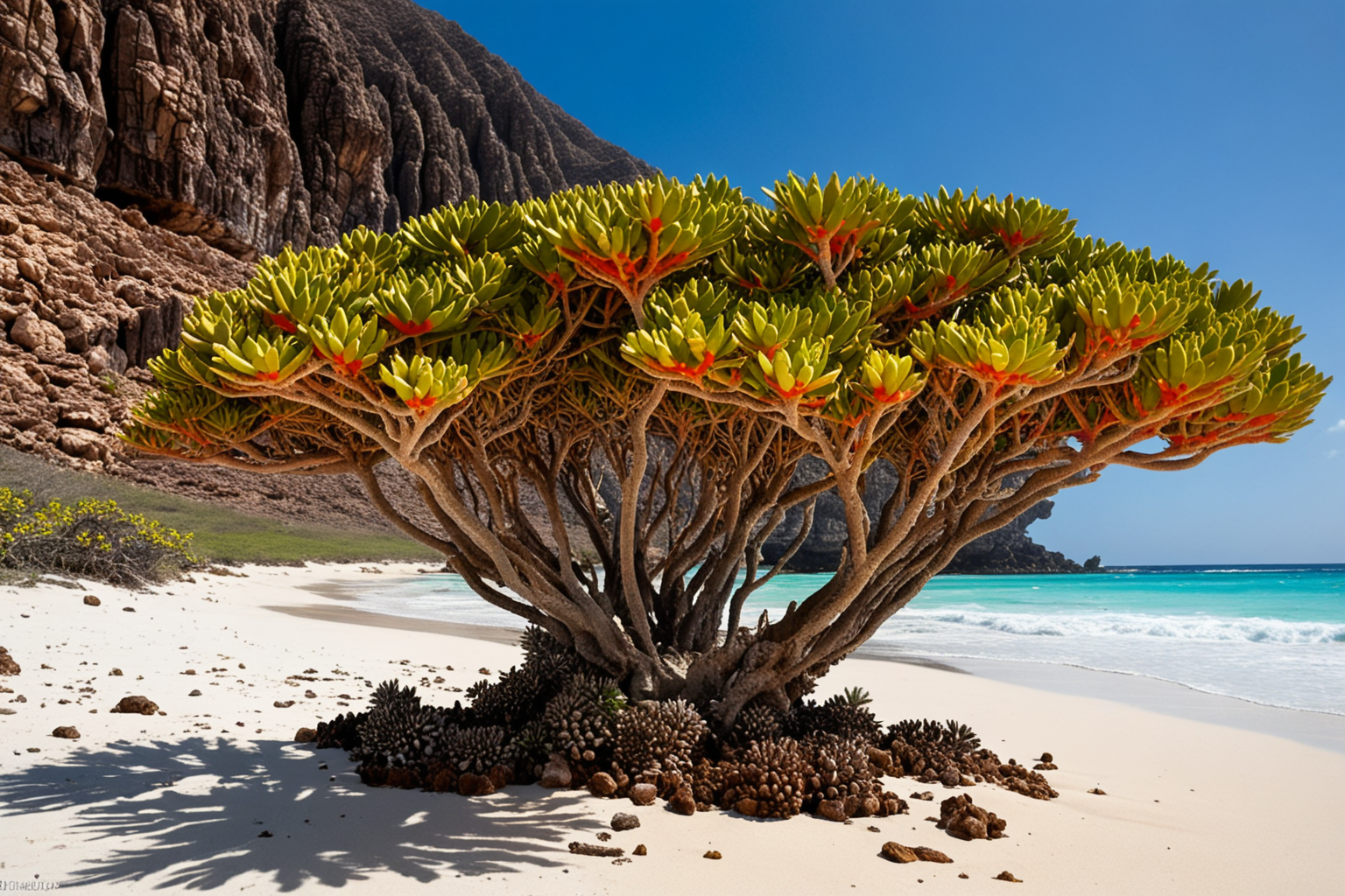 NSFW, Socotra Yemen, Filippo Tommaso Marinetti style, Socotra, Yemen, landscape, ancient plant species, dramatic cliffs, pristine beaches, alien beauty, biodiversity, unique, awe HD, sharp focus, stunningly beautiful, isometric style, vibrant, beautiful, crisp, detailed, ultra detailed, intricate